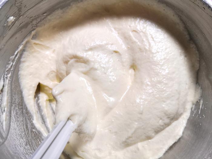 7、取三分之一的蛋白霜放入调好的蛋黄糊中,搅拌均匀后再次倒回剩下的蛋白霜中。(翻拌时不要画圈,速度尽量快一些。)