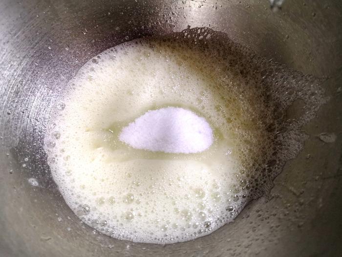 4、15分钟过后将蛋清拿出,然后加入少许柠檬汁和少许白砂糖后用电动打蛋器打成大泡沫状。(白砂糖要分3次加入。)