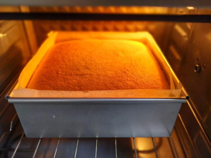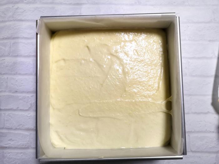 8、面糊都搅拌好后倒入烤盘中,多震几下消泡。