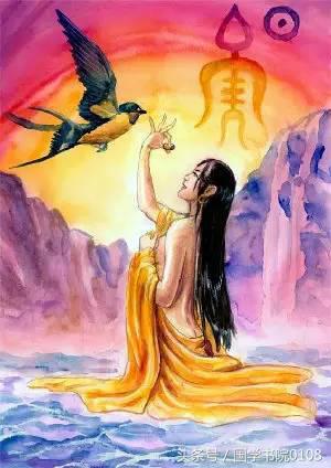 在远古的黄河之滨,一只“玄鸟”唱着歌儿从空中飞来,带给人们无穷无尽的遐想――它是天的使者,原始部落的人们一个个对它顶礼膜拜。一个叫简狄的女人,吞服“玄鸟”下的蛋后,怀孕生下一个儿子叫契。契,即是阏伯,就是传说中的商之始祖。《诗经·商颂·玄鸟》曰:“天命玄鸟,降而生商。”这就是“玄鸟生商”的美丽故事。