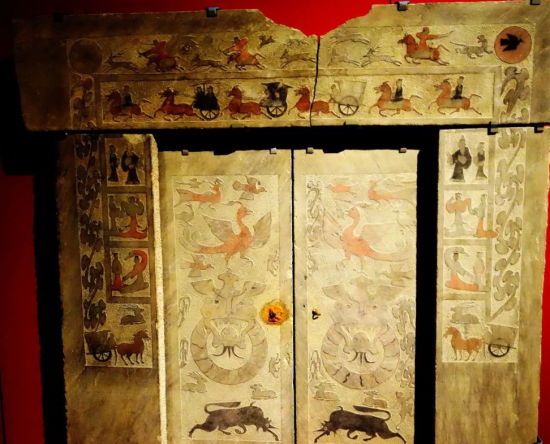 神木大保当匈奴墓出土的彩绘石墓门,具有典型的汉文化色彩