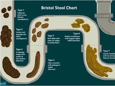 3型的形状类似于香肠,但表面有裂缝。而4型的外观与3型相似,但表面光滑柔软,呈香蕉状,也被专家们普遍认为是最健康和最典型的粪便形式。而5 型的粪便呈比较软的半固体状,成形。这三种类型的大便均可以被轻松排出,被认为是正常大便的代表。