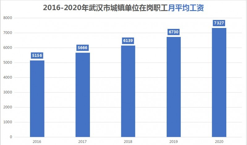 2020年,武汉市城镇单位月平均工资为7327元,相比2016年增长了2171元,5年涨幅为 42%。
