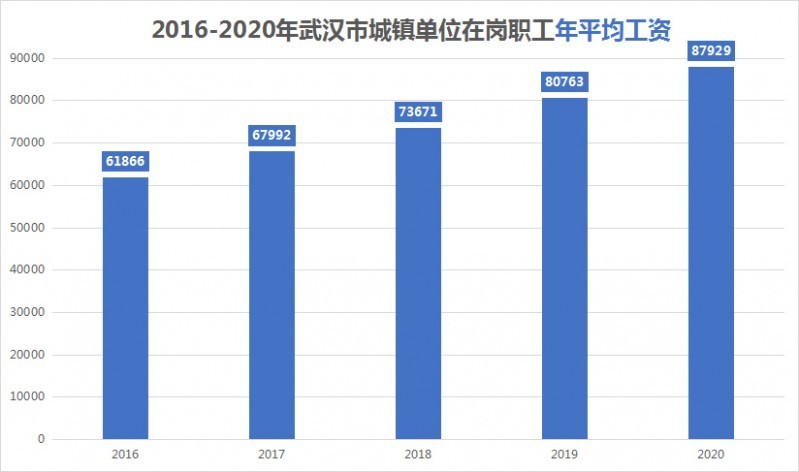 2020年,武汉市城镇单位年平均工资为87929元,相比2016年增长了26063元,5年涨幅为 42%。