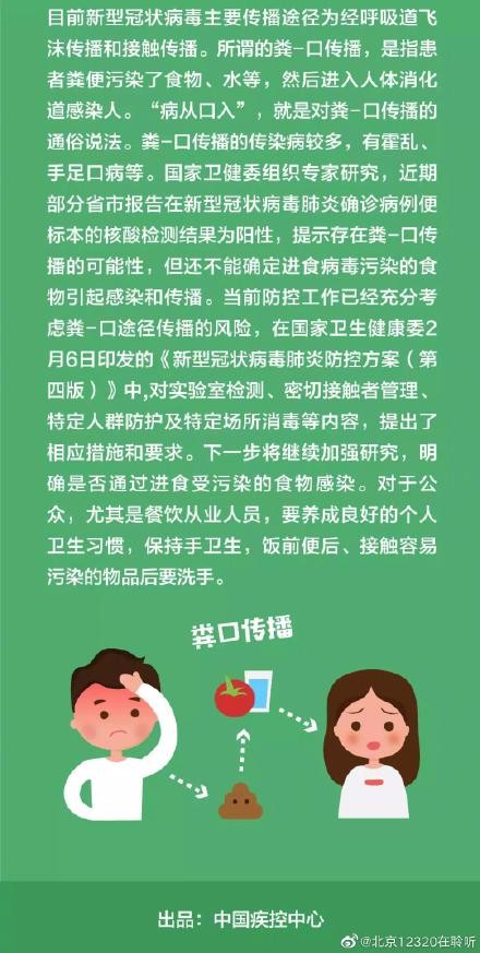 【粪--口传播是什么意思?】所谓的粪--口传播,是指患者粪便污染了食物、水等,然后进入人体消化道而被感染。病从口入,就是对粪--口传播的通俗说法。粪--口传播的传染病较多,如霍乱、手足口病等。国家卫健委组织专家研究,发现近期部分省市报告在新型冠状病毒肺炎确诊病例便标本的核酸检测结果为阳性,提示存在粪--口传播的可能性,但还不能确定进食病毒污染的食物可引起感染和传播,下一步将继续加强研究,明确是否通过进食受污染的食物可引起感染。(国家疾控中心)