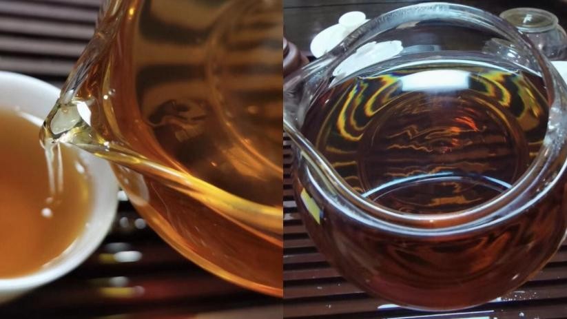 了解完茶叶的区别后我们再来看看茶汤。上好的生普洱茶冲泡出来的茶汤呈金黄色。熟普洱茶叶冲泡出来的茶汤颜色红褐。因为茶叶在家里存放的时间长短也不一样,所以茶汤也会出现不同的阶段。如果茶汤看上去浑浊且有杂质,颜色还是黑褐色,这种茶就不属于好茶,如果是茶艺的问题还好,就怕是变质的熟普洱茶。