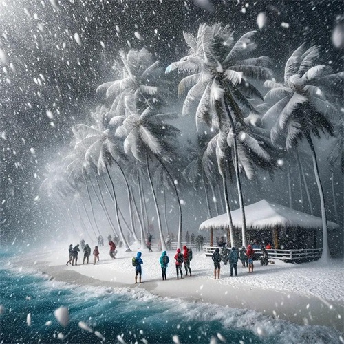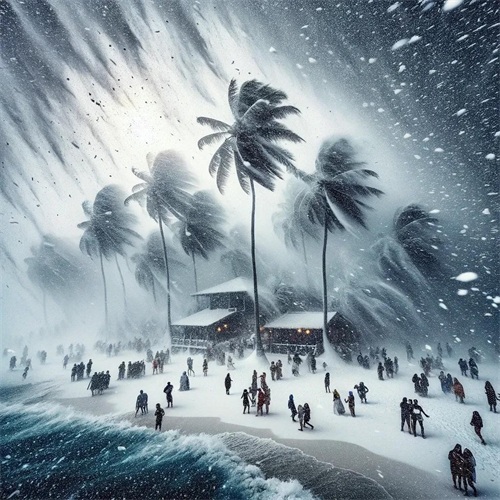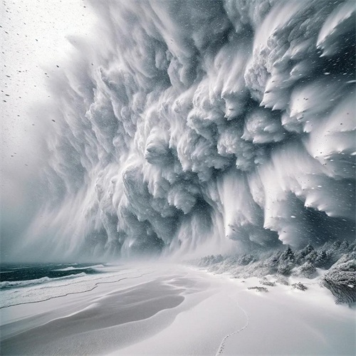 它说:这是一幅想象中最极端的暴雪袭击海滩的场景图像。