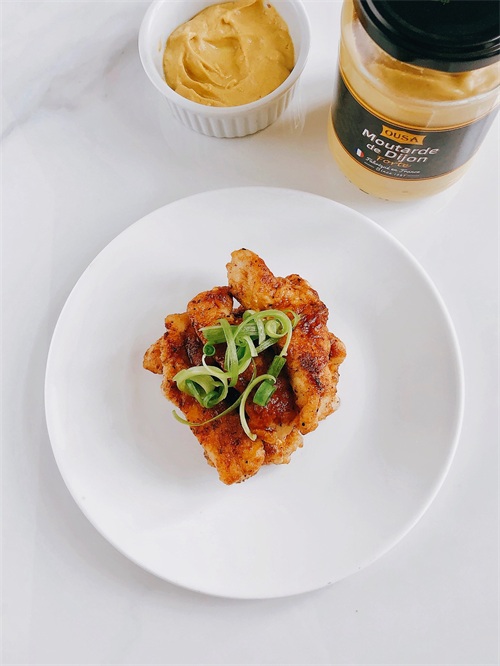 1小勺酱油,1cm的黄芥末拌匀,裹满煎好的鸡胸肉,摆上小葱~