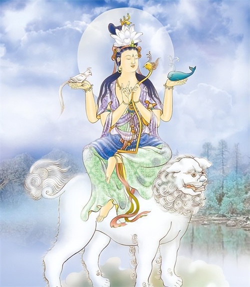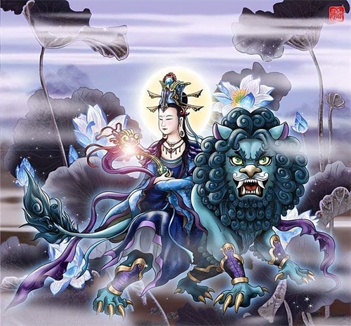 他的地位非常高,是智慧的化身,他的道场在五台山,坐骑是一头青狮,又名:“虬首仙”。我们都知道狮子是百兽之王,可降服百兽,而文殊的智慧,也能降服一切烦恼。