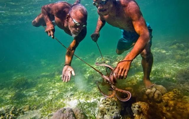 为了捡回更多的珍贵海产品,巴瑶人练就了一身的潜水能力,许多巴瑶人能够潜到30米以下的水底。他们会自制一种特殊的护目镜,当潜入水底的时候,能够看清楚水底的动态,然后用自制的木制鱼叉捕鱼。
