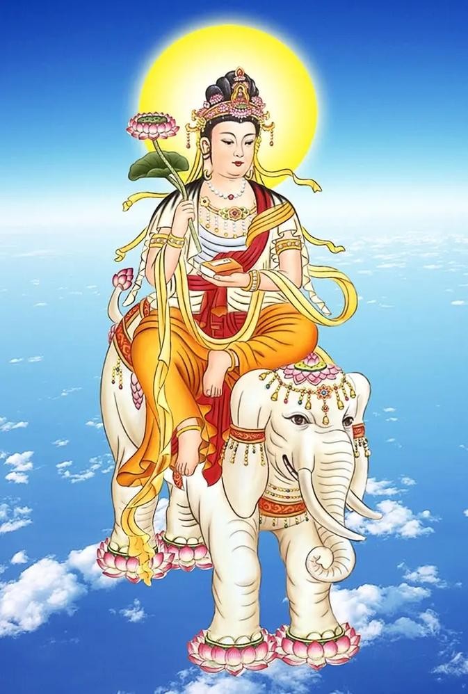 普贤菩萨与文殊菩萨齐名,普贤菩萨代表着修行中的定力和大行,他发愿广度众生,成就一切佛道。普贤菩萨的形象通常被描绘为手持如意棒、骑乘六牙白象,象征着他具有无边的力量。