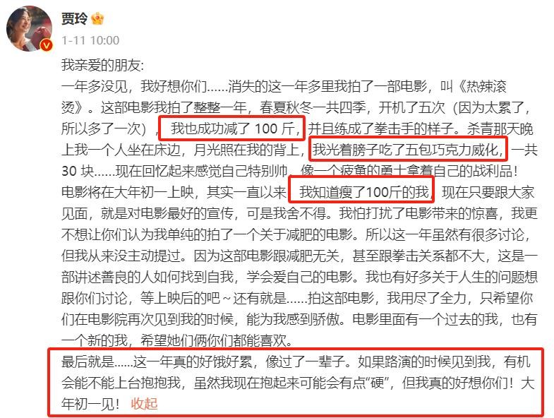 前不久贾玲发微博说自己减肥瘦了100斤,网上也有很多人吐槽她只是为了电影宣传噱头罢了,她也是特地发了微博回应这个事情,在它发的微博里面可以透过文字感受到她很努力去减肥,去完成《热辣滚烫》这部电影,感觉这一次改变为她带来的不仅仅是体重变轻,更是心灵上的洗涤啊。