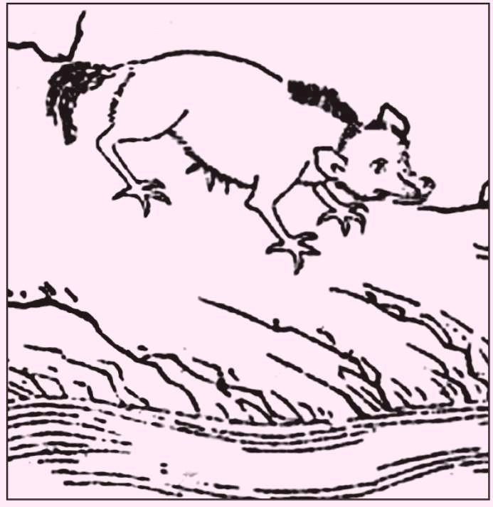 南次二山之首,曰柜山①,西临流黄①,北望诸[图片]③,东望长右①。英水出焉,西南流注于赤水,其中多白玉,多丹粟⑤。有兽焉,其状如豚⑥,有距⑦,其音如狗吠,其名曰狸力,见则其县多土功。