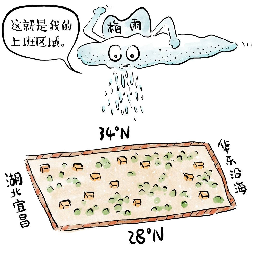 一般在每年的6至7月间,我国江南、长江中下游以及江淮等地区,都会迎来较长时间的梅雨天气,中国梅雨主要分布在江淮区域,即西自湖北宜昌,东至华东沿海,南端以南岭以北的28°N为界,北抵准河沿线34°N一带,涉及上海、江苏、安徽、浙江、江西、湖北、湖南等多省(直辖市)。