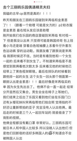 一名大陆网友在小红书上晒出在乐园巧遇宋再临、金素恩一起出游照片,写下「去个三丽鸥乐园偶遇精灵夫妇,我嗑的古早CP居然是真的!!!」,文中透露两人并未遮掩,有一名女助理随行,网友曝光的照片中虽然仅拍到背影,但对比宋再临、金素恩近日陆续有在各自IG上晒出于日本三丽鸥乐园的照片,且穿着与该大陆网友拍到的相似,因此大大提升了该爆料文的可信度。