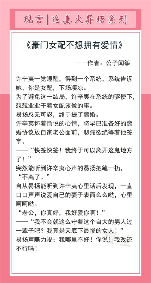 短评:女主许辛夷按系统的吩咐当一名敬业的女配,好不容易熬到豪门老公提出离婚的时候,没想到老公易扬忽然听到她的心声,发现她表里不一,一气之下不离了。而后,霸总易扬从不屑一顾到追妻忙碌,女主沙雕人设,鉴婊达人,内心OS如万马奔腾,让男主越看越有趣,进而爱得无法自拔。这篇文超级解压,让人嘴角翘飞!