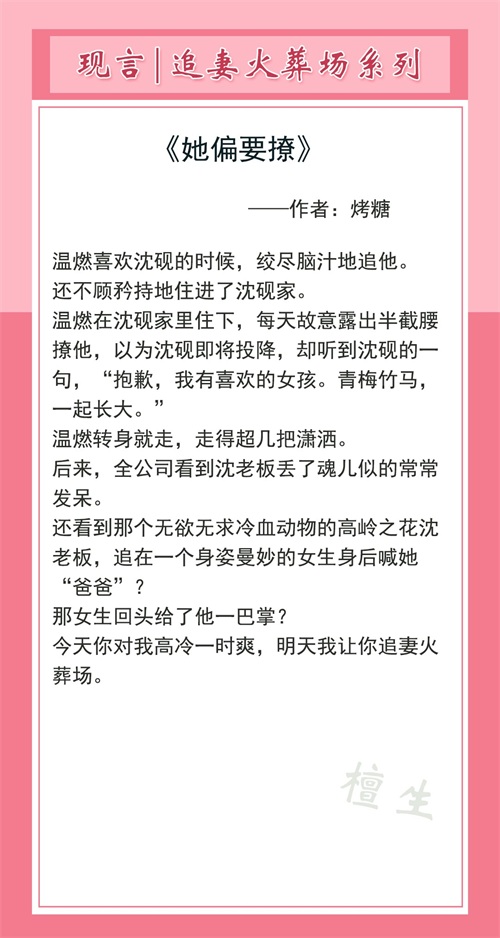 短评:女主温燃小妖精人设,热情小火焰,喜欢高岭之花男主沈砚之后,就勇敢追爱,结果惨遭拒绝。被拒后,女主潇洒离去,男主则开始空虚寂寞。这时轮到男主开始发疯追求,看着女主和异性亲昵相处,他醋意上头各种卑微各种心机,最终求爱成功抱得美人归。剧情酸酸甜甜,虽然是狗血的梗,但是读起来很美好,就小推吧!
