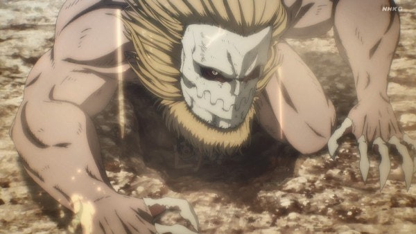 「盔甲巨人」(铠の巨人):身高为15 公尺。全身多处覆盖了硬质化的组织,如同穿了盔甲一样。再生能力非常的差,遭到破坏的部位必须花费极长的时间才能修复,能够将精神传输至巨人体内,因此即便破坏后颈也不一定能将其杀死。