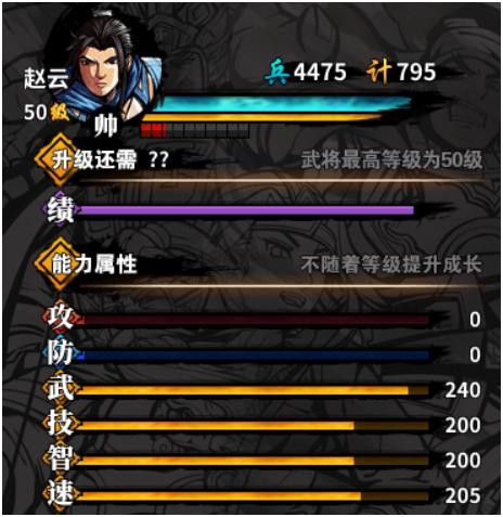 基础数值:赵云的武、技、智、速均属良好以上,综合优秀,五虎里面综合最强。可以从入手一直用到最后的武将!不过奇怪的是,明明赵云是技型武将,却“仅200”,以至于很多人误以为马超比赵云强很多(下面会介绍武将技赵云会比马超强)。可能是用于平衡赵云很高的会心率吧。