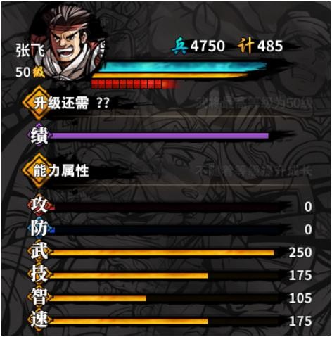 基础数值:武力比武圣还高出10点,仅次于吕布,达到250,相当优秀的存在,非常符合三爷在演义中“百万军中取上将首级如探囊取物”的设定。此外兵力值也比武圣略高。技和速都属于偏弱,智力甚至属于弱智。这个在后期是非常危险的。其实按演义中入蜀和打击张郃的神级表现,可以在入蜀剧情中增加70智力,略低与二爷(虽然这在游戏后期作用也不大)。