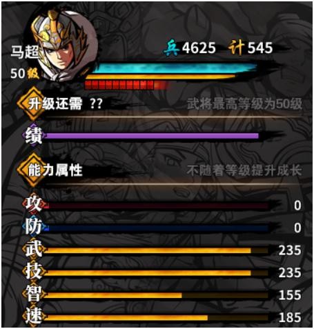 基础数值:马超的武+技所有武将中最高的。虽然但看武力值好像不太合理,一般认为比赵四略高一点到245比较合理。但是由于他的被动技能可以把他很高得技数值补充到普攻中,所以用起来手感上佳。速度配不上他的西凉铁骑称号,估计也是出于平衡考虑。智力方面就没什么好说,低是合理的,但是三爷说马儿竟比我高50点,这礼貌吗?!^_^。