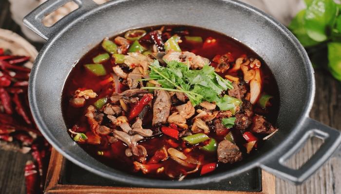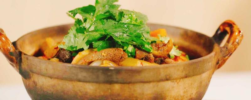 13、砂锅中倒入炒好的羊杂,小火煨煮,收汁后撒上葱花、香菜即可。