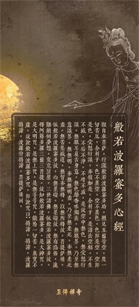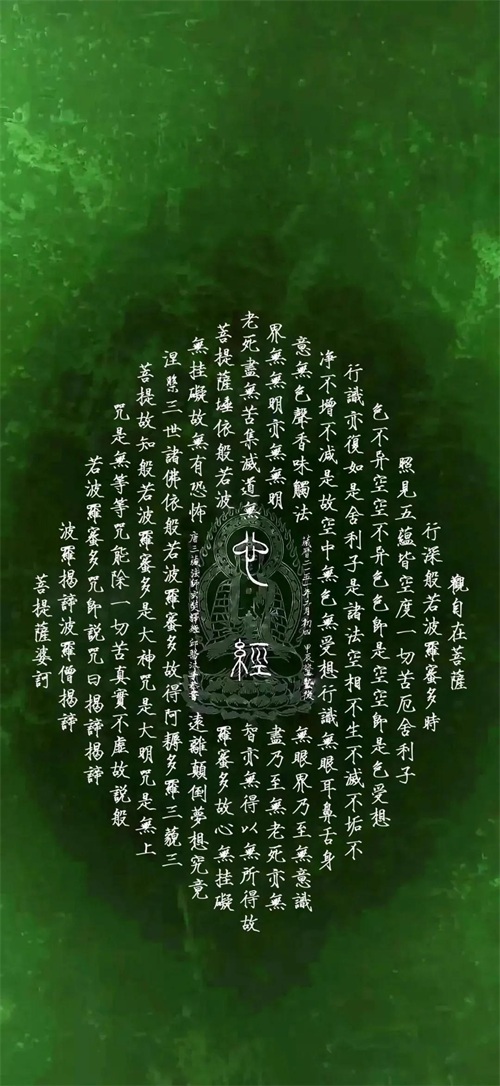观自在菩萨,行深般若波罗蜜多时,照见五蕴皆空,度一切苦厄。舍利子,色不异空,空不异色,色即是空,空即是色,受想行识,亦复如是。舍利子,是诸法空相,不生不灭,不垢不净,不增不减。是故空中无色,无受想行识,无眼耳鼻舌身意,无色声香味触法,无眼界,乃至无意识界,无无明,亦无无明尽,乃至无老死,亦无老死尽。无苦集灭道,无智亦无得。以无所得故。菩提萨埵,依般若波罗蜜多故,心无挂碍。无挂碍故,无有恐怖,远离颠倒梦想,究竟涅盘。三世诸佛,依般若波罗蜜多故,得阿耨多罗三藐三菩提。故知般若波罗蜜多,是大神咒,是大明咒,是无上咒,是无等等咒,能除一切苦,真实不虚。故说般若波罗蜜多咒,即说咒曰:揭谛揭谛,波罗揭谛,波罗僧揭谛,菩提萨婆诃。