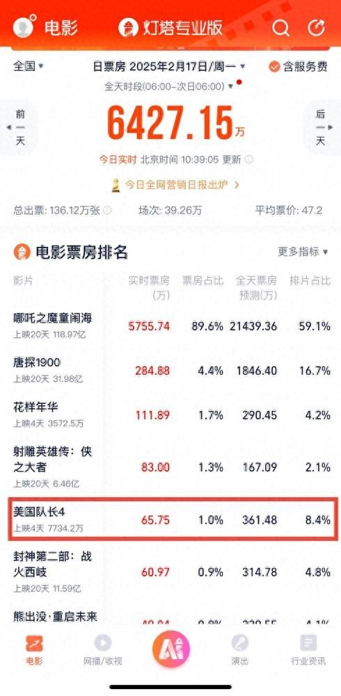 截至2月17日记者发稿,《美国队长4》上映以来的国内累计票房仅7733万元,票房占比仅为1%,预测国内总票房不足2亿元。