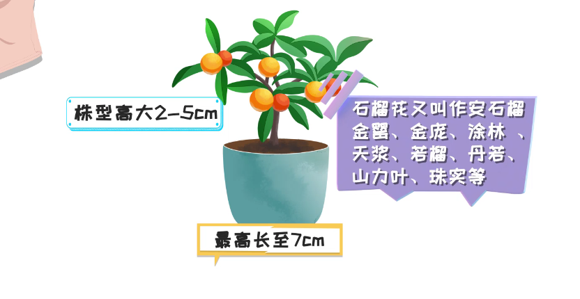 石榴花呈四棱形,花尊钟形,生于枝顶或叶腋,橙红色,表面光滑具腊质,花瓣均为5-7枚。新叶嫩绿或古铜色,单叶对生,叶面光滑。果实呈现浆果球形,黄红色。