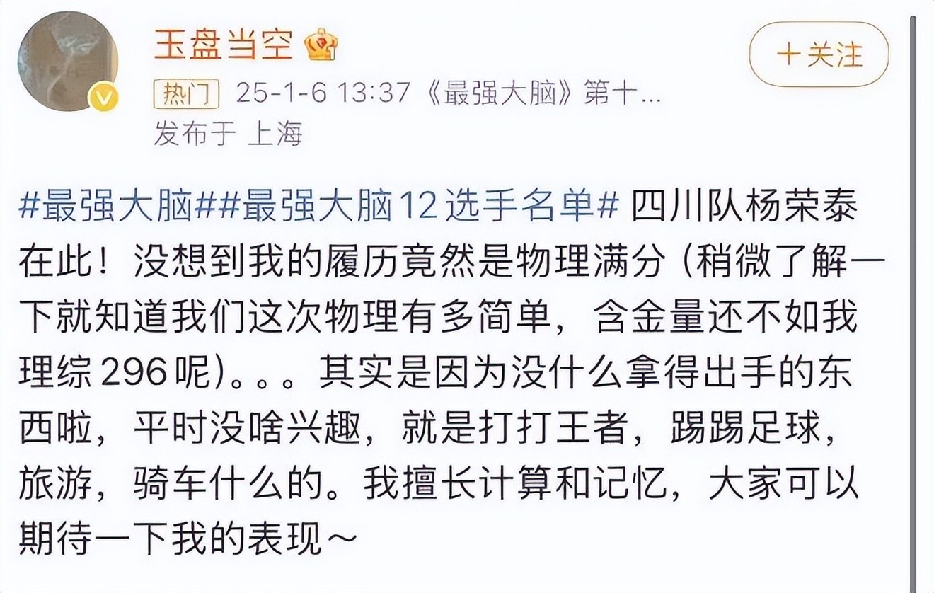 在16支省队选手名单中,有眼尖的网友也关注到了,四川队共有4位选手参加,其中一人正是毕业于成都市树德中学,现就读于上海交通大学的大一学生杨荣泰,他在2024年四川省高考中取得过物理满分的好成绩。
