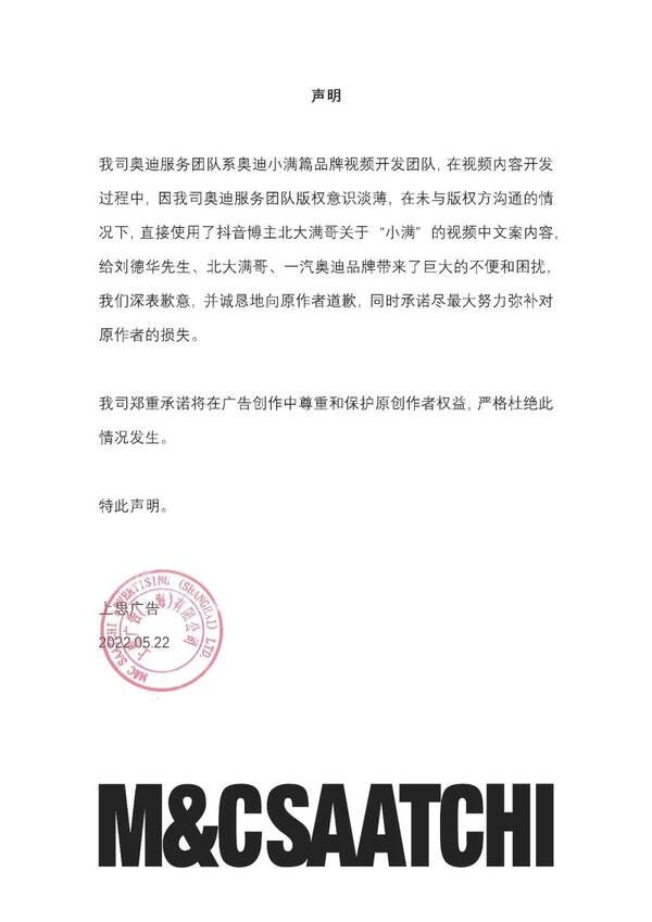 至此,一汽-大众奥迪的这些小满广告视频深陷抄袭的舆论漩涡中。5月22日,一汽-大众奥迪方面对此向刘德华和北大满哥道歉,此外表示,该视频由创意代理公司M&C Saatchi提报并执行,本着不回避问题的原则,我们已责成其尽快就所涉文案侵权情况进行处理,给公众一个满意的答复。同时,在事实正式澄清之前,奥迪各官方渠道将全面下架该视频。