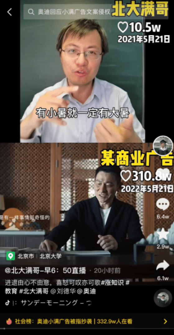 但当晚就“翻车”了,21日晚间抖音博主北大满哥发对比视频称,奥迪广告视频抄袭其于2021年5月的原创视频,并强调视频中诗词也是自己原创的。