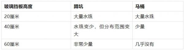 曾有人做了一个实验进行对比。研究人员在冲厕所的水中加入荧光素钠,在坐厕和蹲厕的上方放置玻璃板,通过调节玻璃板的高度来了解冲水时的气旋高度。通过观察玻璃板上的荧光素钠,来判断厕所水珠飞溅的情况。结果如下表: