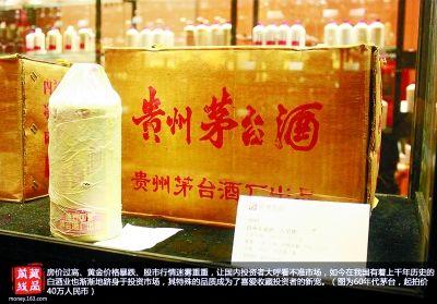 据北京歌德盈香拍卖有限公司副总裁刘剑锋介绍,今年6月1日晚,在该公司举办的2014年春季拍卖会上,一瓶出产于1958年的五星牌贵州茅台酒,就以单瓶成交达299万的高价一举摘得单瓶拍王的桂冠,并刷新陈年茅台酒的最高拍卖成交价。陈年茅台酒除拍出单瓶最高价外,100瓶出产日期为上世纪80年代初期的“五星牌”贵州茅台酒也以828万元拍得全场最高价。据悉,当晚陈年茅台专场总成交额超过1亿元。