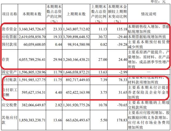 报告期内,山西汾酒存货40.56亿元,同比增加24.40%,占总资产比例的29.94%,主要系原酒产能提升、产量增加,原材料、在产品增加,成品酒季节性增产所致;应付账款15.92亿元,同比增加78.33%,占总资产比例11.75%,主要系未付包装材料、原材料款项增加所致;应付职工薪酬5.96亿元,同比增加31.65%,占总资产比例的4.40%,主要系本期未付计提的养老保险及企业年金增加所致;支付给职工以及为职工支付的现金5.45亿元,同比增加1.07亿元。