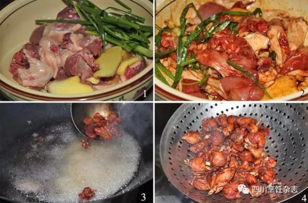 净锅上火放宽油,烧至七成热时,下腌好味的鸭块,炸至表面略带黑色且已变酥时,倒出来沥油(见图3、4)。