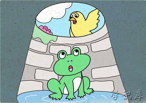 小鸟说:“你弄错了。天无边无际,大得很哪!”青蛙笑了,说:“朋友,我天天坐在井里,一抬头就能看见天,我不会弄错的。”小鸟也笑了,说:“朋友,你是弄错了。不信,你跳出井来看一看吧。”