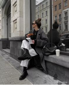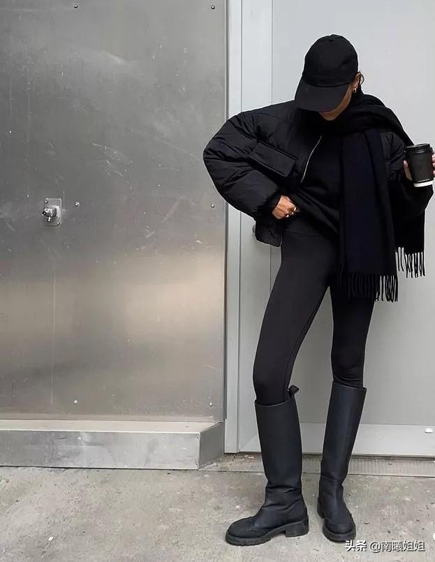 :尼龙面料的黑裤子是有光泽且流畅的,这种面料是近几年流行,尝尝运用在鲨鱼裤、瑜伽裤上,所以这些裤子也是紧身款式,冬季搭配的上衣以廓形宽松为主,松紧得当,显瘦显高。