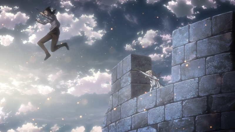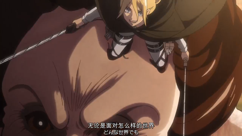 此时尤弥尔已经决心变成巨人保护克里斯塔,在拿刀划破自己手掌之际对克里斯塔说到:“克里斯塔......我没有权力对你的生活指手画脚,所以这仅仅...只是我的一个愿望... ,你要挺着胸膛活下去喔。”说完则变身巨人跳下了下去。