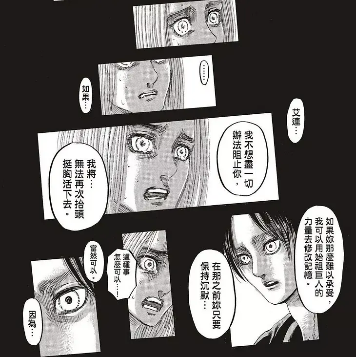 但是最终希斯特利亚在艾伦的劝说下动摇,不再反对艾伦的灭世计划,同时替艾伦保密。但她配合艾伦的方式不是逃走也不是反抗高层,而是去生一个孩子来搅黄继承吉克巨人之力的计划。