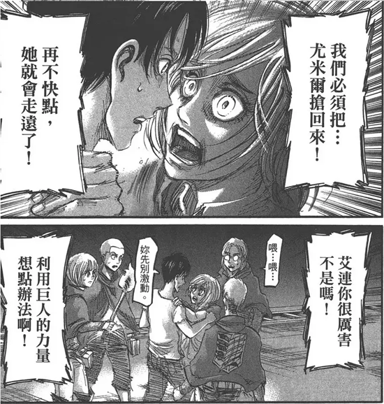 “再不快点,她就走远了,艾伦你很厉害不是吗?!利用巨人的力量想点办法啊!”