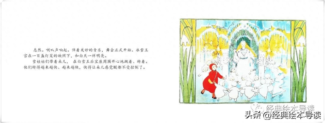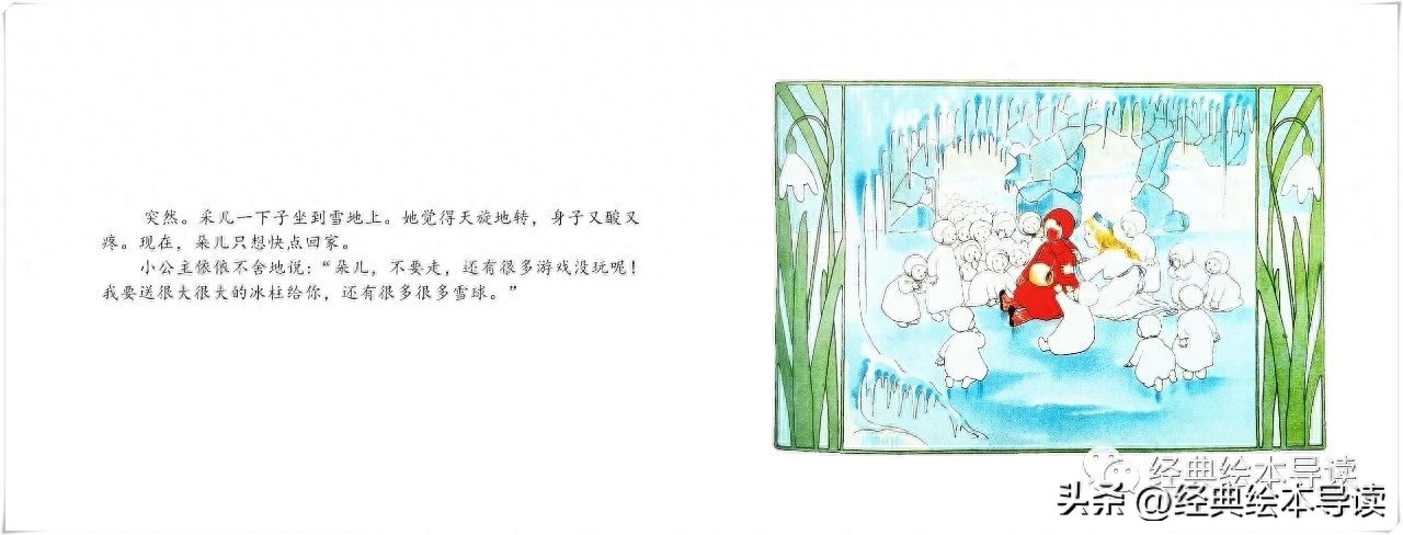 这个以冰雪为主题的童话,没有跌宕起伏的故事情节,也没有复杂的人物关系,就是一个非常素净、纯粹、唯美、简短的故事。文字经过千锤百炼,简洁而生动,富有韵律和画面感。