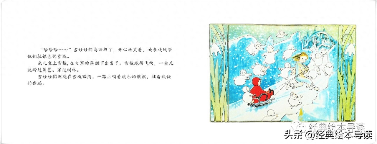 原文:“哈哈哈……”雪娃娃们高兴极了,开心地笑着,喊来旋风帮他们拉银色的雪橇。朵儿坐上雪橇,在大家的簇拥下出发了。雪橇跑得飞快,一会儿就跨过篱笆、穿过树林。雪娃娃们围绕在雪橇四周,一路上唱着欢乐的歌谣,跳着欢快的舞蹈。