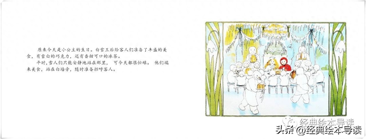 原文:原来今天是小公主的生日。白雪王后给客人们准备了丰盛的美食,有雪白的巧克力,还有香甜可口的冰茶。平时,雪人们只能安静地站在那里,可今天都很忙碌。他们端来美食,站在白墙旁,随时准备招呼客人。