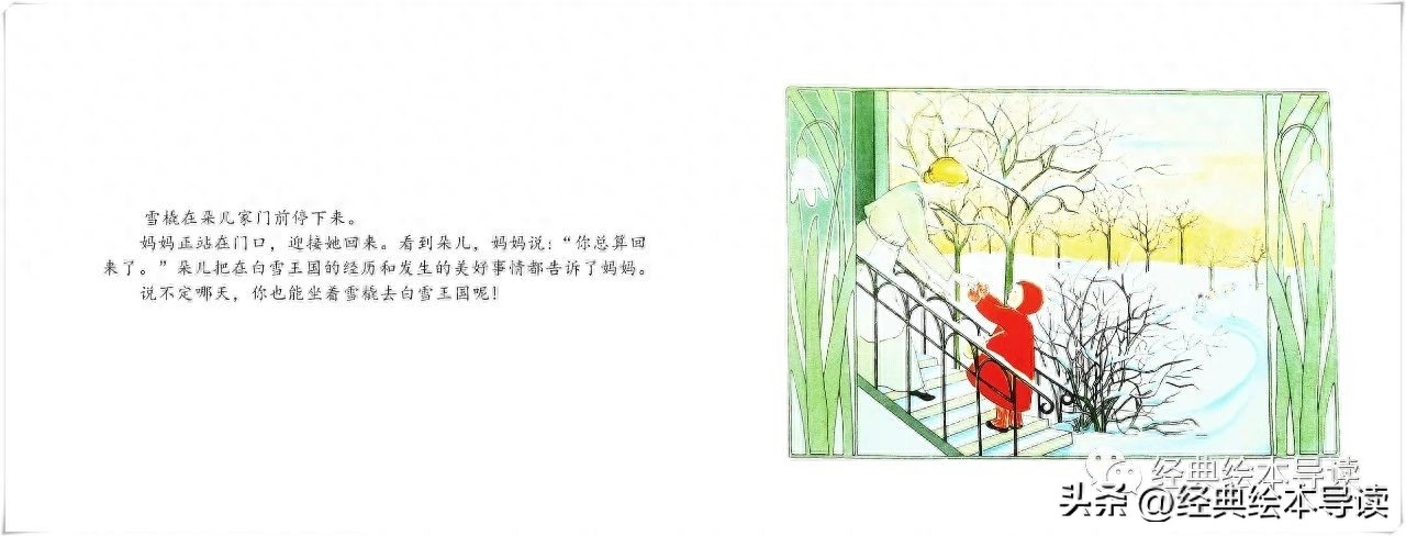 朵儿又回到了现实中,见到了妈妈。而雪车也也已经远去,现实与幻想交织在一起,这也是孩子所特有的。