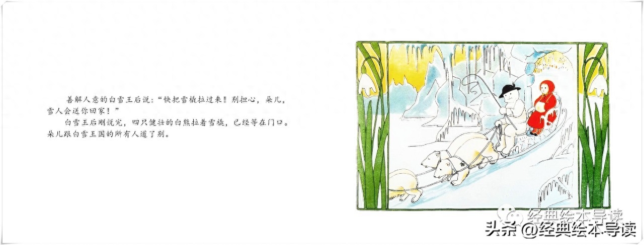 原文:善解人意的白雪王后说:“快把雪橇拉过来!别担心,朵儿,雪人会送你回家!”白雪王后刚说完,四只健壮的白熊拉着雪橇,已经等在门口。朵儿跟白雪王国的所有人道了别。