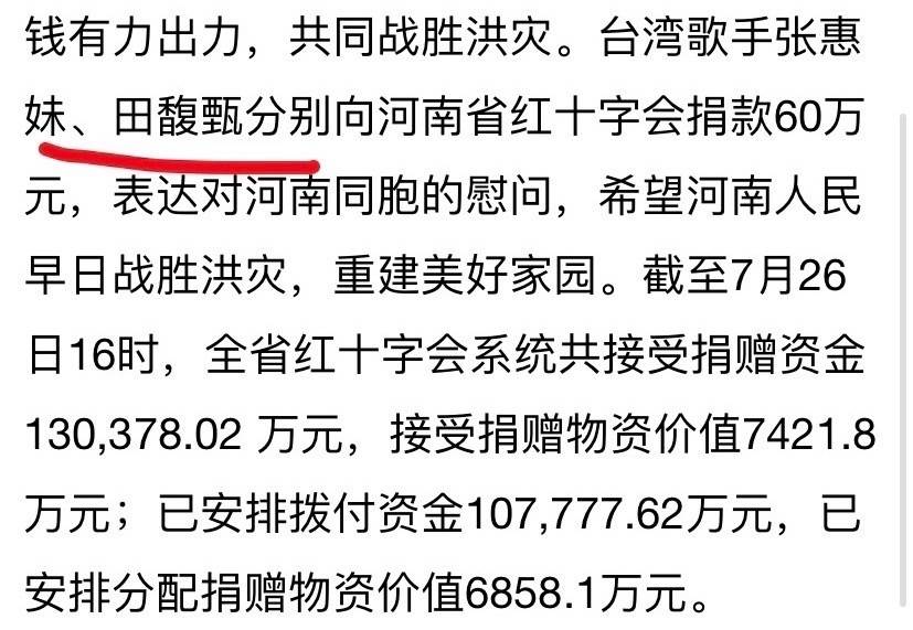 今年河南洪灾时,田馥甄向河南省红十字会捐了60万元。