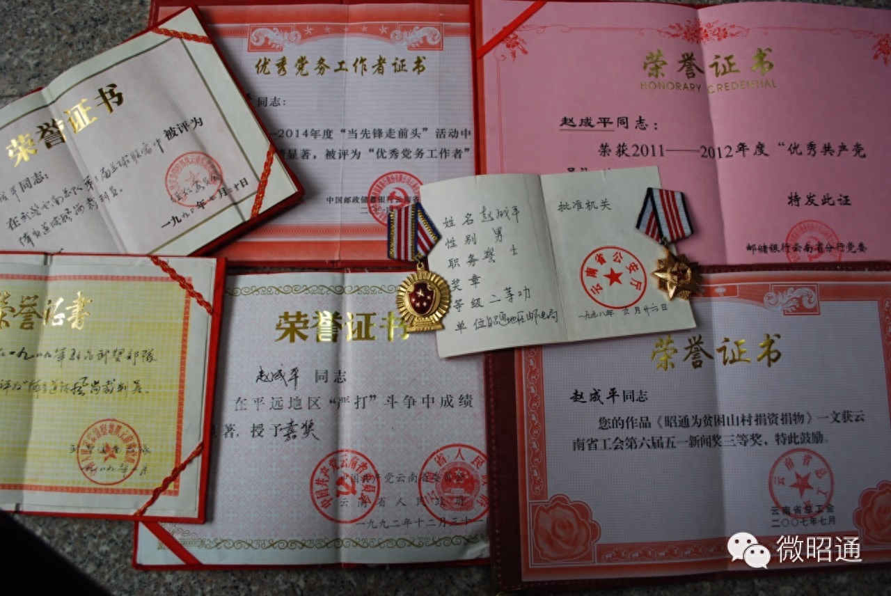 “认识我的人,都叫我‘老英雄’,搞得我都不好意思!”在昭通城珠泉路邮电小区一套七八十平方米的简陋三居室了,赵成平一边拾掇着他的奖励、奖章等“宝贝”,一边微笑着介绍他们的来历。