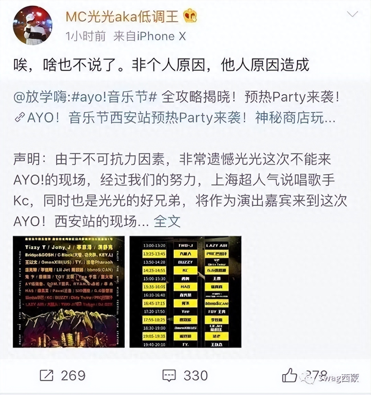 19、“演出方,对待你跟我,都得区别”:个人认为是指代Jony J拒绝和光光出现在同一个音乐节的事情。