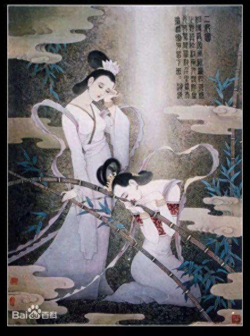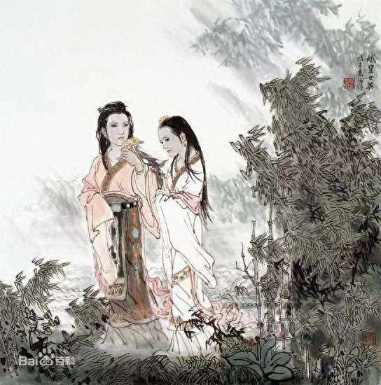 娥皇和女英刚刚嫁给舜的时后,舜的家庭关系还比较复杂,他爹瞽叟(gǔ sǒu)是个瞎子,人也糊涂,自己的亲娘又死得早,瞽叟给他娶了一个后妈,生了两个同父异母的孩子,弟弟叫象,妹妹名敤手(kě shǒu,民间传说手特别巧)。可想而知,在这样的家庭里,做个好儿媳是很有挑战性的工作。好在这两位美人很是贤惠,从来不因出身高贵而使性子、添乱子,对舜一家子老小一直侍候得很周到。因此,《史记》里夸她俩“甚有妇道”。